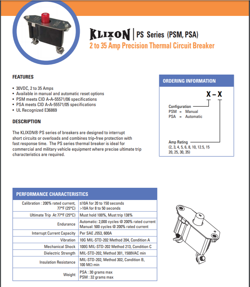 KLIXON@PS系列斷路器設(shè)計(jì)用于中斷短路或過載,并結(jié)合了無跳閘保護(hù)和快速響應(yīng)時間。PS系列熱斷路器適用于需要精確極限跳閘特性的商用和軍用車輛設(shè)備。