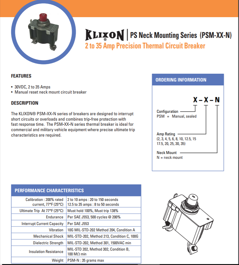 KLIXON@PSM-XX-N系列斷路器設(shè)計用于中斷短路或過載,并結(jié)合了無跳閘保護(hù)和快速響應(yīng)時間。PSM-XX-N系列熱斷路器適用于需要精確極限跳閘特性的商用和軍用車輛設(shè)備。