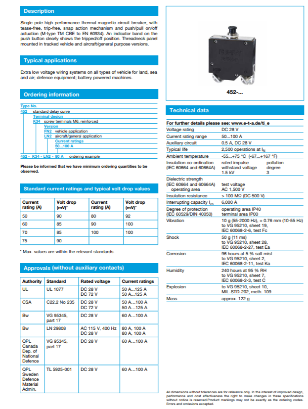 EN60934)。按鈕底部的白色指示環(huán)可以清晰的顯示脫扣/OFF狀態(tài)。頸項(xiàng)面板安裝,適用于履帶式車輛,航空器和通用應(yīng)用,快跳型磁脫扣和輔助觸點(diǎn)可選。