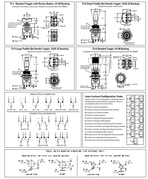 這些微型開關(guān)是堅固的,高度可靠的開關(guān)提供積極的制動行動,安全的開關(guān)操作。T3系列具有獨特的奧托速動開關(guān)機(jī)構(gòu)和獨特的撥動執(zhí)行機(jī)構(gòu)設(shè)計,提供速動觸點驅(qū)動。奧托設(shè)計的高接觸壓力和卓越的擦拭作用使T3系列成為從邏輯電平切換到5安培負(fù)載的絕佳選擇。選擇密封單極或雙極電路,15/32-32密封或1/4-40非密封套管結(jié)構(gòu),瞬時和/或保持運行。15/32-32襯套型號還提供杠桿鎖定撥動功能或拇指按鈕執(zhí)行器。模壓端子密封觸點,防止?jié)駳夂秃竸┬疚?。根?jù)MIL-DTL-83731,15/32-32襯套型號的前面板側(cè)密封防水和其他液體。除了MIL-DTL-83731中規(guī)定的單轉(zhuǎn)臺焊接端子外,我們還提供兩種不同長度的針用于印刷電路焊接。提供的安裝硬件包括兩個六角螺母、一個鎖緊墊圈和一個鍵槽墊圈。